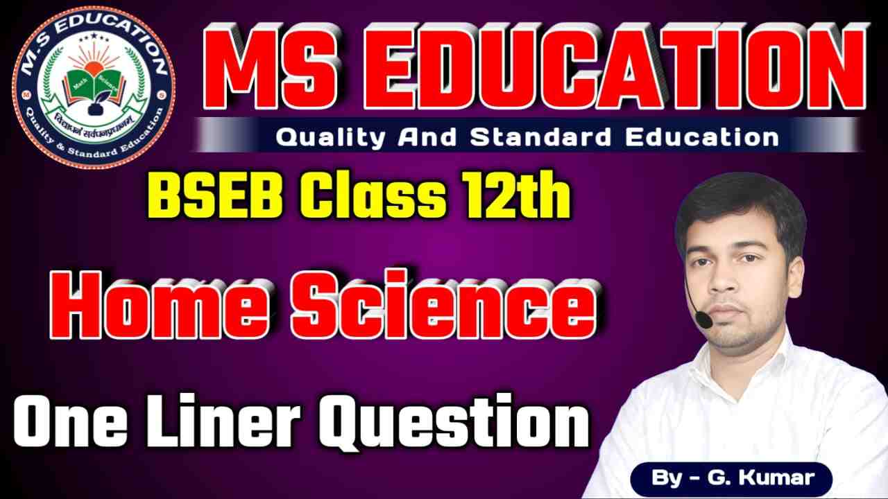 Bihar Board 12th Home Science One Liner Question :- MS Education में स्वागत है आप सभी विद्यार्थियों के लिए हमारे शिक्षण संस्थान MS Education के द्वारा Bihar Board Class 12th Home Science का Chapter Wise Basic Study Material दिया गया है जो आप सभी के लिए बहुत महत्वपूर्ण है जिसे आप पढ़ कर BSEB 12th Board Exam में अच्छा Marks ला सकते हैं|